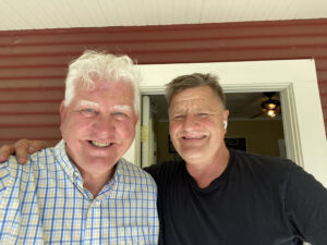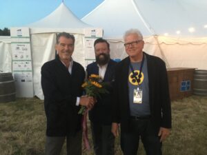 Pierce Brosnan, Michael Fox, I standing in front of the Mendocino Festival Tent.